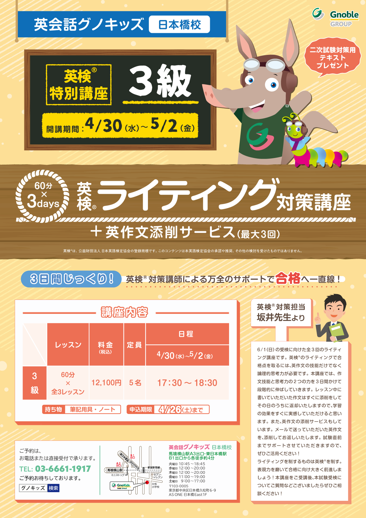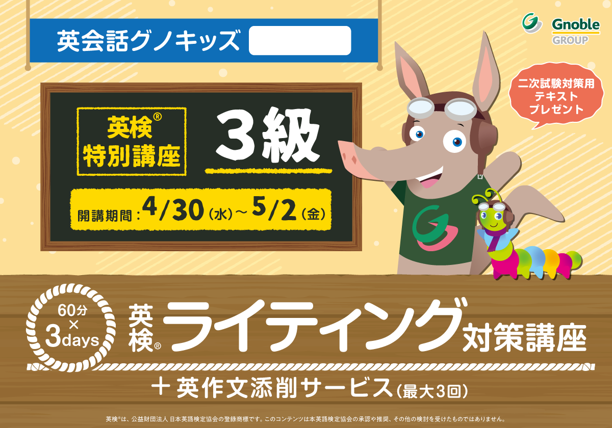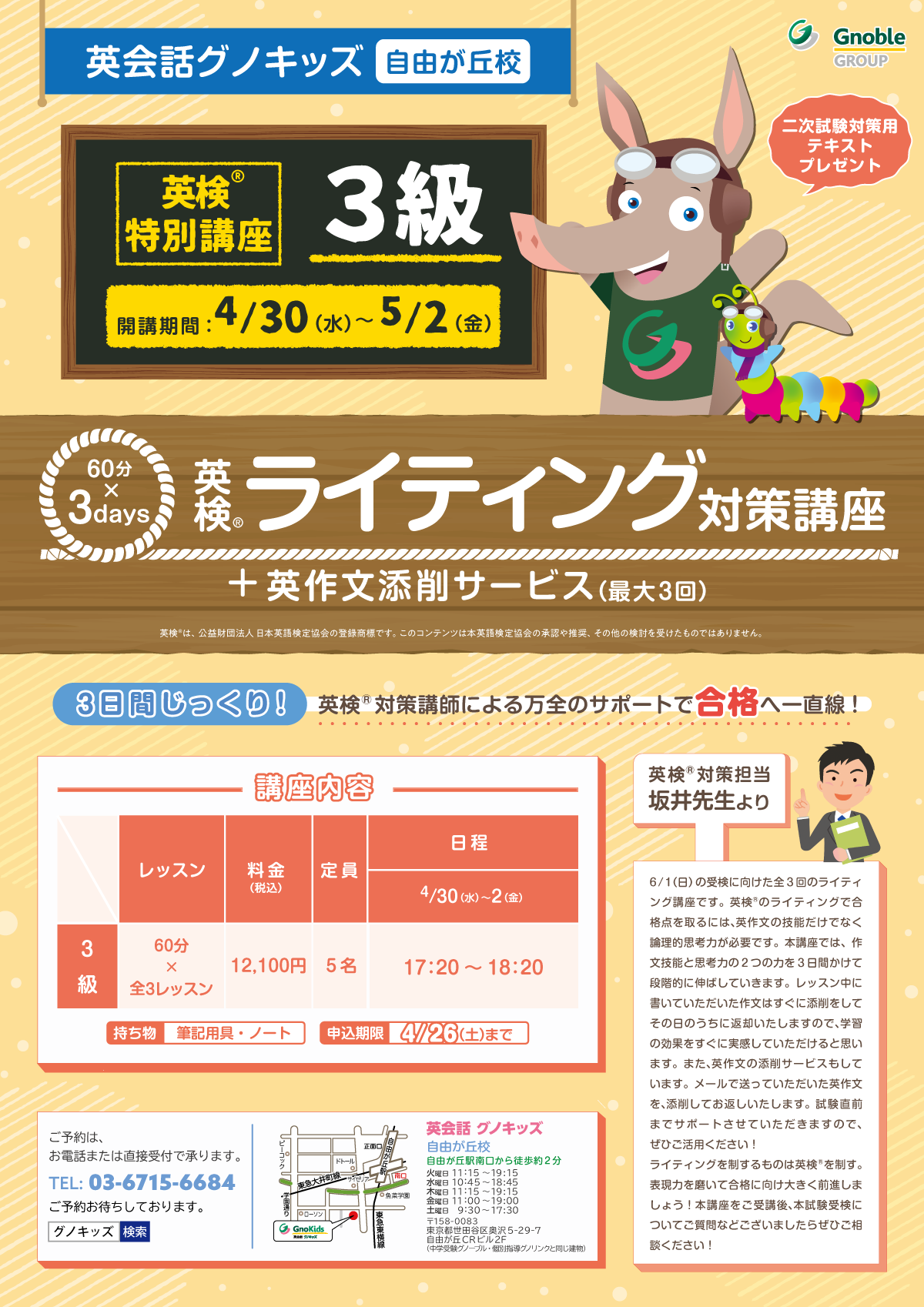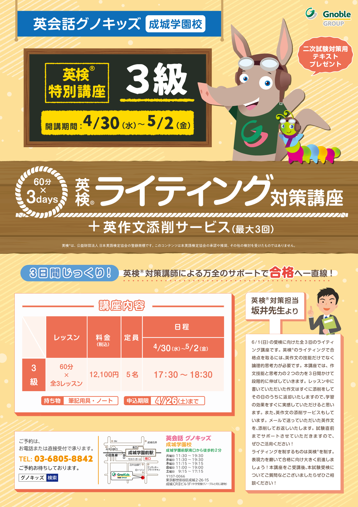 成城学園校、自由が丘校、白金高輪校、日本橋校で4月30~5/2日に英検®ライティング対策講座を開講します。