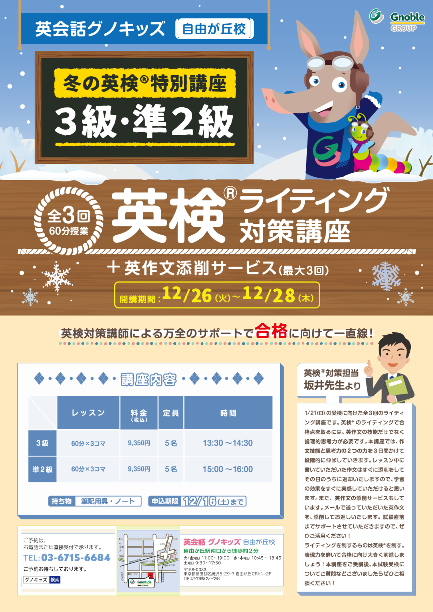 英検3級ライティング対策 : 12,100円(税込)/60分×3日間+英作文添削サービス3回分+二次試験対策用テキストプレゼント